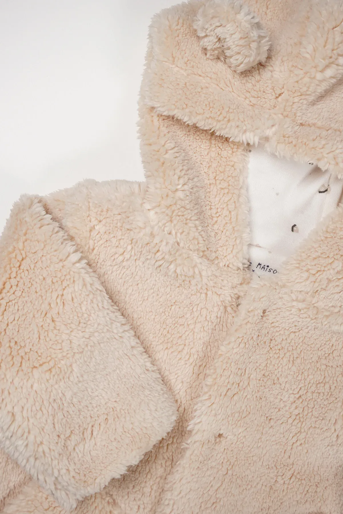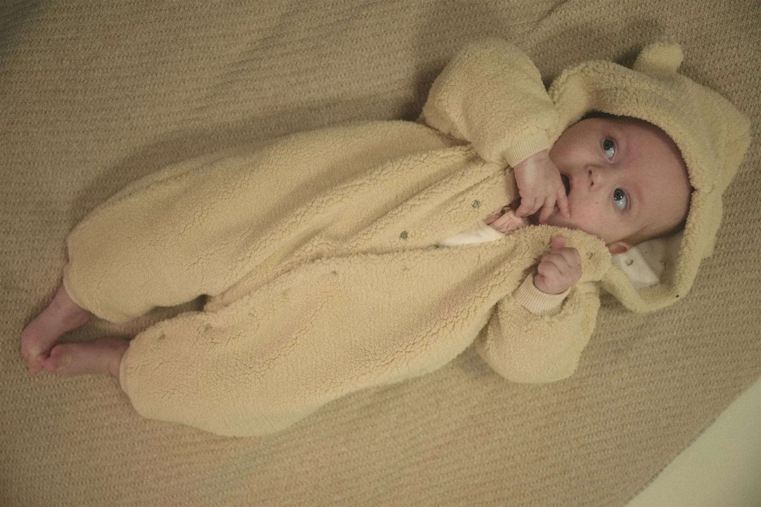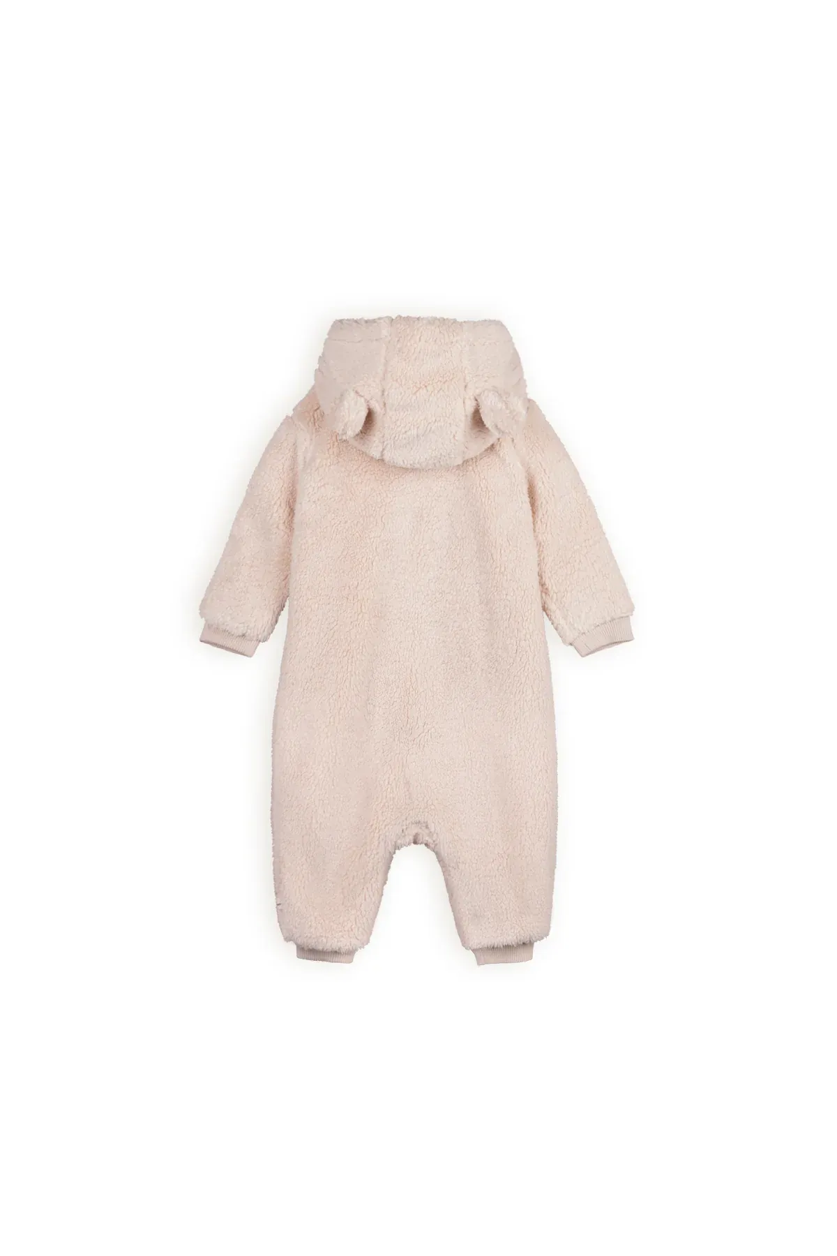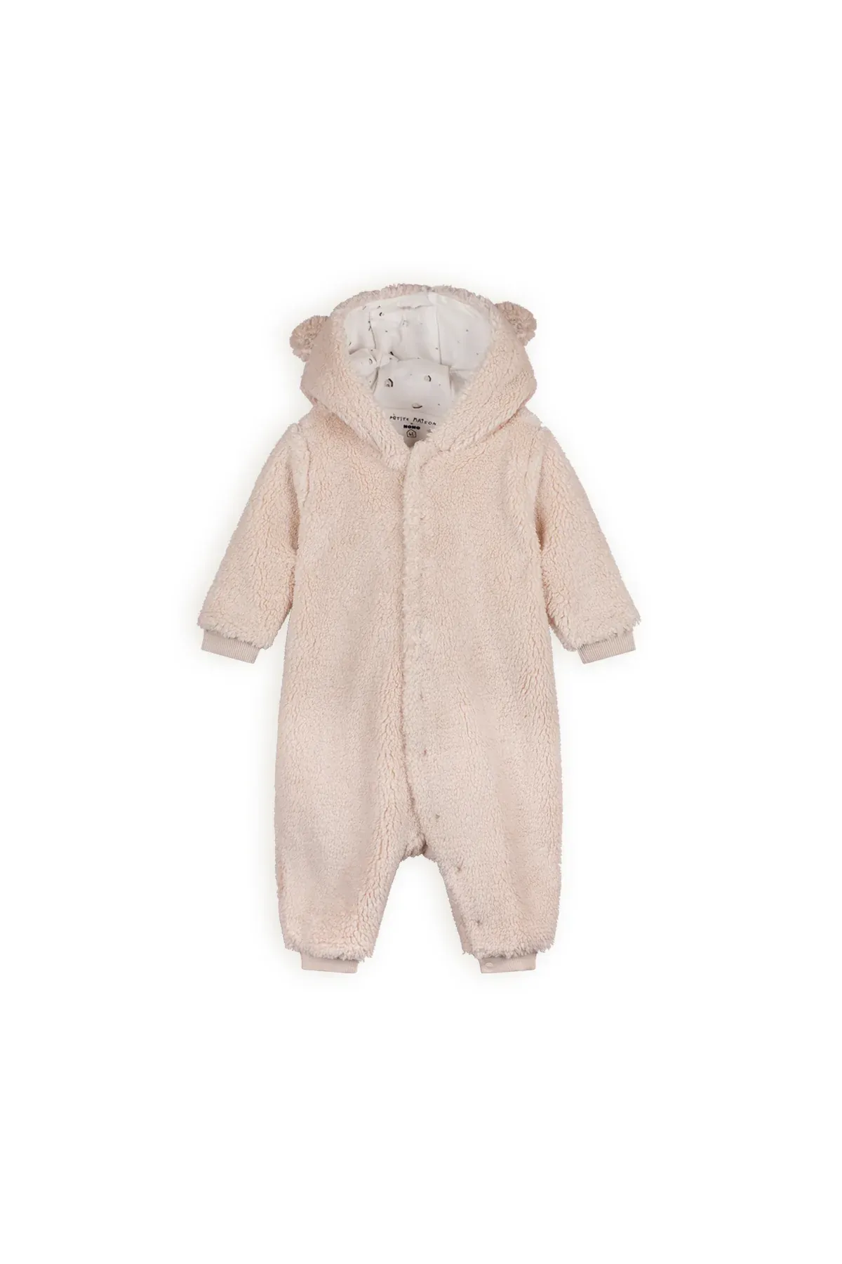 Zacht fluffy teddy pak met capuchon van het merk Petite Maison, compleet met beren oortjes! Dit pak is perfect voor de koudere dagen, met rib manchetten aan de mouwen en zoom voor een extra knus gevoel. Met handige drukknoopsluiting aan de voorkant voor eenvoudig aan- en uitkleden.