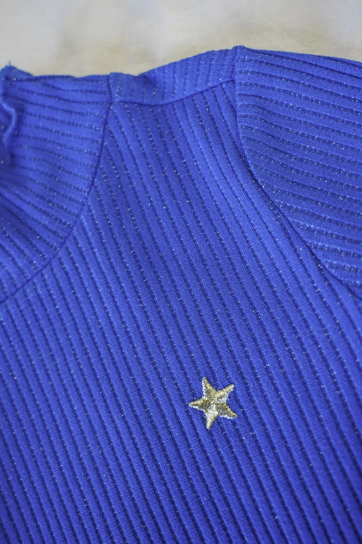 Dit heerlijke zachte jersey mêlee jurkje van Like Flo heeft een zachte stof. Hij heeft hippe puffy sleeves en is gemaakt in een prachtige blauwe kleur kleur met lurex glitter draad. Het rokje is van een mooie blauwe plissé stof met subtiel panterprint dessin.