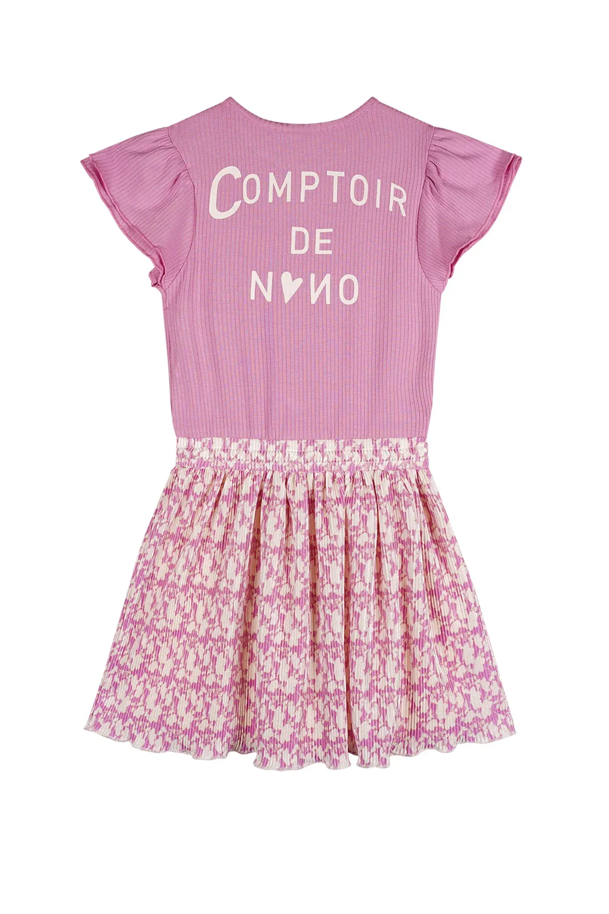 Deze combi jurk biedt een perfecte balans tussen comfort en een unieke stijl! De bovenkant is gemaakt van rib jersey van Ecovero, een milieuvriendelijke versie van viscose die zacht aanvoelt en een bewuste keuze is. De rug is versierd met een grote ‘Comptoir de Nono’-print, die verwijst naar ons merk, wat ‘de toonbank van NONO’ betekent. Het rokdeel is extra bijzonder door de plissé jersey met een speelse alloverprint, wat zorgt voor een opvallende en dynamische uitstraling. Een stoere en trendy keuze voor elke gelegenheid!
