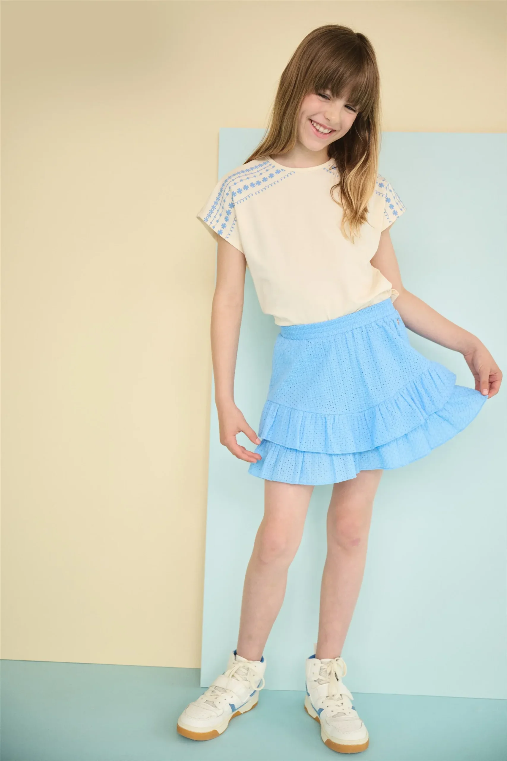 Dit rokje met volledige borduursels is een speelse en geliefde keuze! Het biedt een mooie structuur en is heerlijk licht en comfortabel om te dragen. Dankzij het ingebouwde broekje als voering kunnen meisjes zich vrij bewegen, perfect voor al hun avonturen. Een vrolijke en praktische toevoeging die elke outfit verfrist!