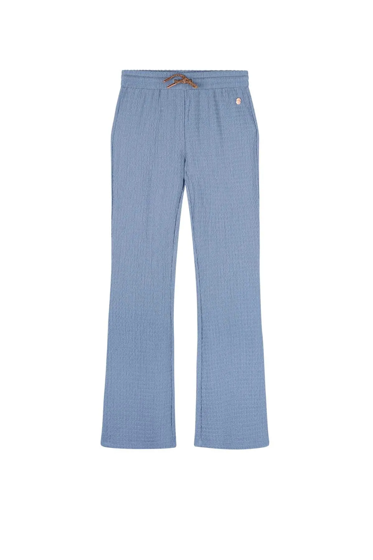 Deze flared broek in stoer denimblauw biedt ultiem comfort en is ideaal om mee te combineren! Gemaakt van zachte, gestructureerde jersey van 100% gerecycled polyester, voelt de broek heerlijk zacht aan. Het gevlochten koord in de taille maakt het eenvoudig om de pasvorm naar wens aan te passen. Perfect voor dagelijks gebruik en een veelzijdige toevoeging aan je garderobe!