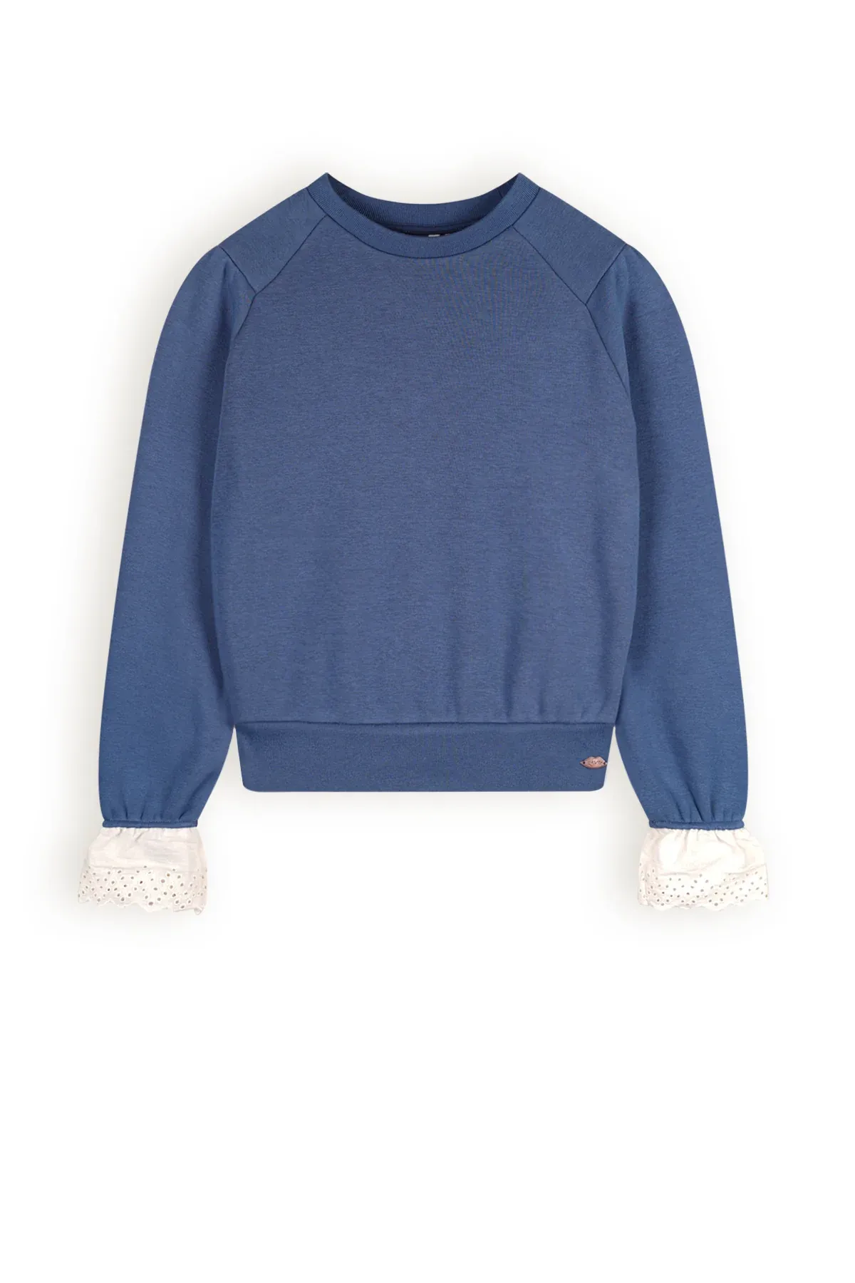 Sweater van het merk NoBell’ met contrasterende boorden en een opdruk op de achterzijde.