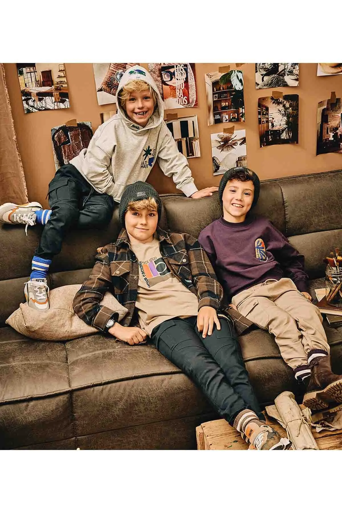 Sweater Sylvan is in de kleur Blueberry Muffin en hij heeft een terry toweling artwork op de chest. Op de rug zit een groot artwork die op dezelfde manier is gemaakt, terry toweling zijn hele kleine lusjes garen, wat ook wel op badstof lijkt. Leuk op cargo Vance.