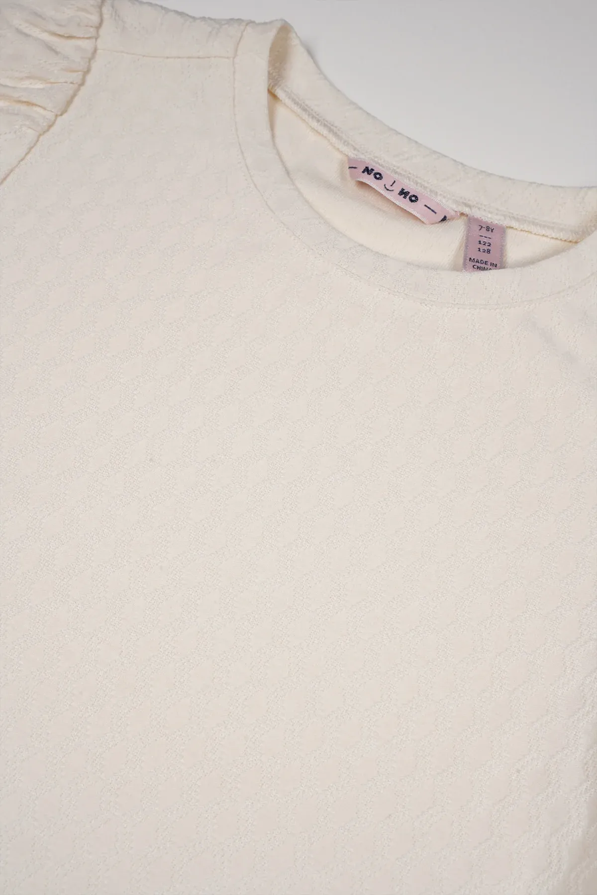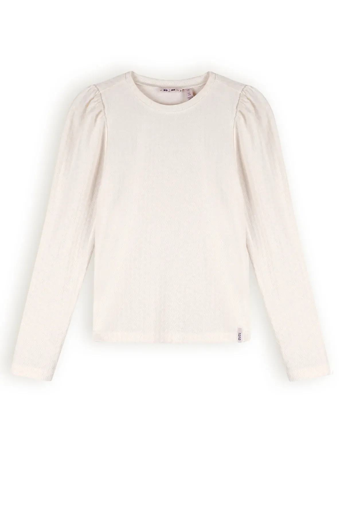 NONO top met ronde hals en lange mouwen. De longsleeve heeft subtiele pofmouwen en een leuk werkje in de stof verwerkt.