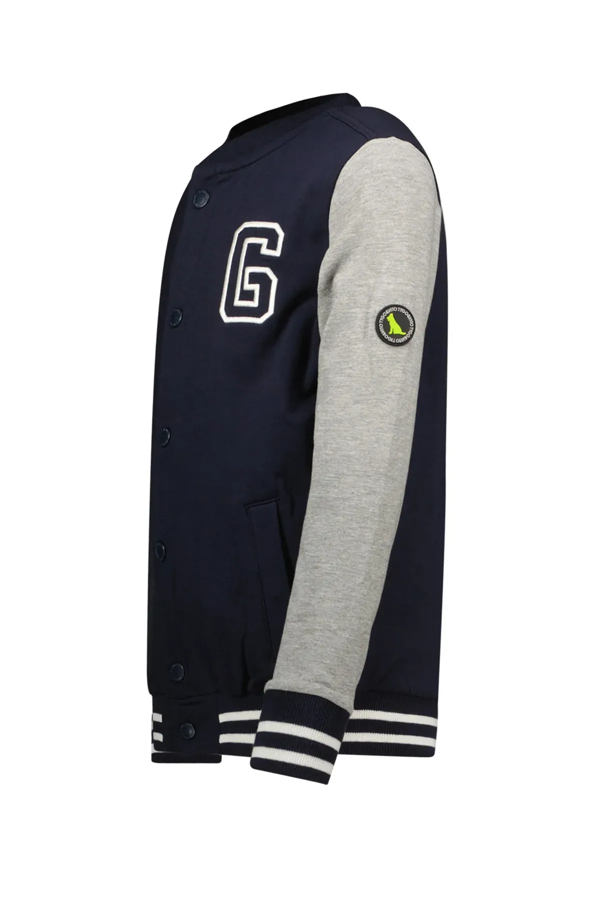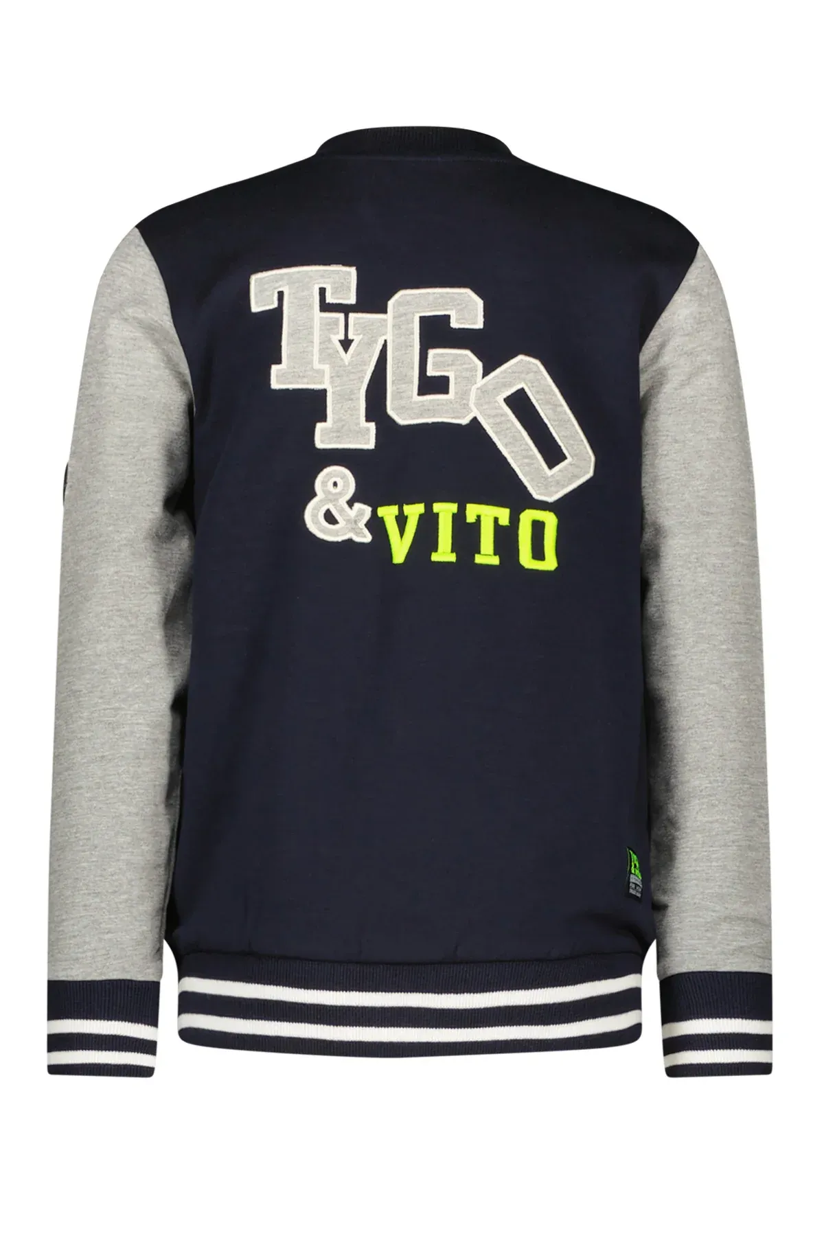 Baseball vest van TYGO & vito in navy met grijze mouwen, artwork op de borst en mooie borduur op de rug. TYGO & vito gebruikt graag biologisch katoen, omdat het is geteeld zonder gebruik van chemische bestrijdingsmiddelen.