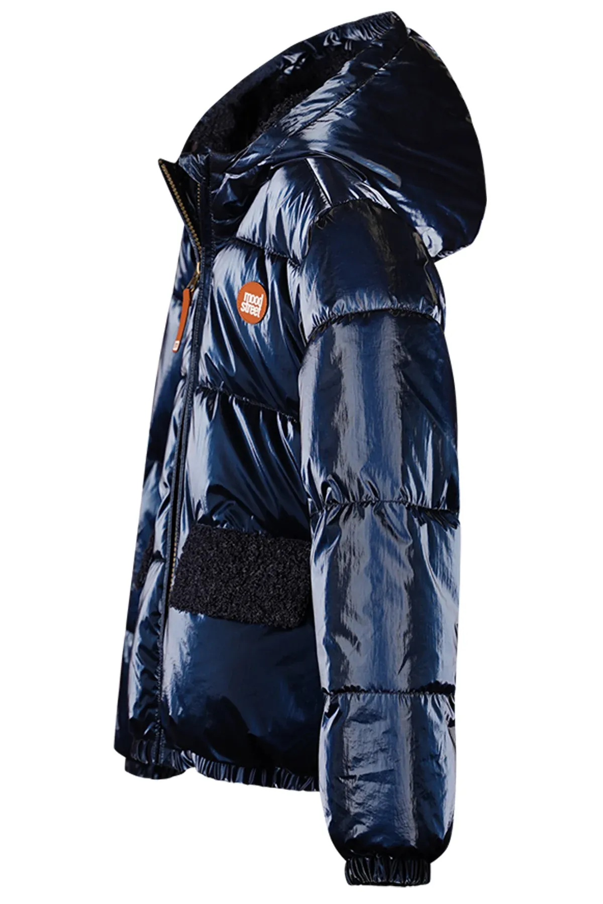 Stoere metallic winterjas van Moodstreet in een prachtige ice blue kleur. De stoere grote zakken op de voorkant van deze jas houden je handen lekker warm. De binnenkant van de jas is van een warme teddy in een ton sur ton kleur. De buitenstof en de padding zijn gemaakt van recycled polyester.